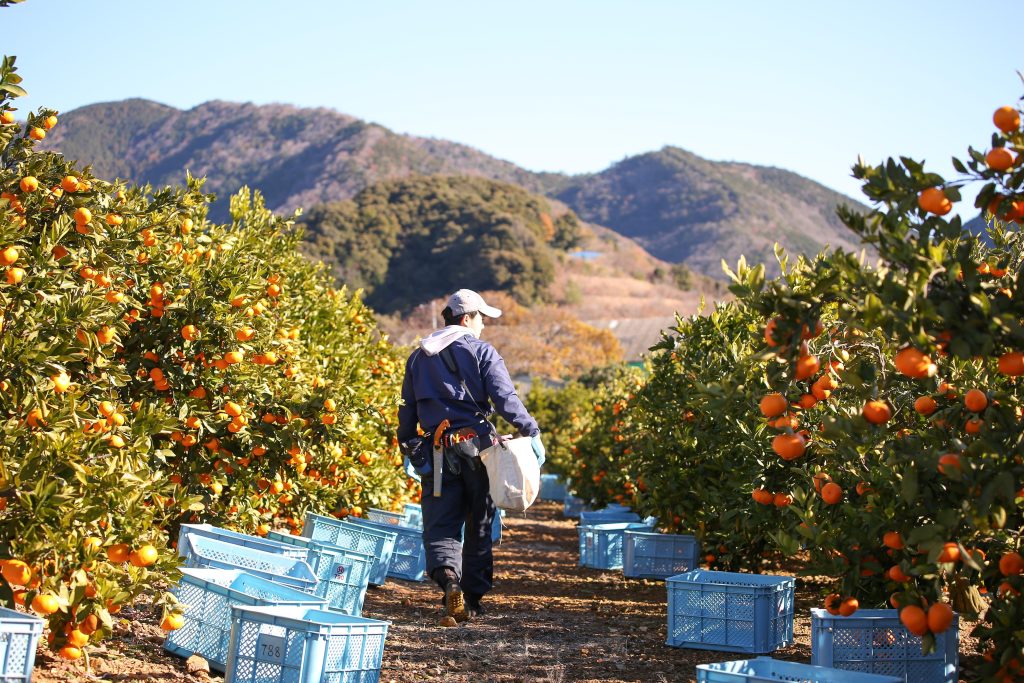 みかんが鈴なりに実った畑の中を、ひとりの社員が歩いていく。